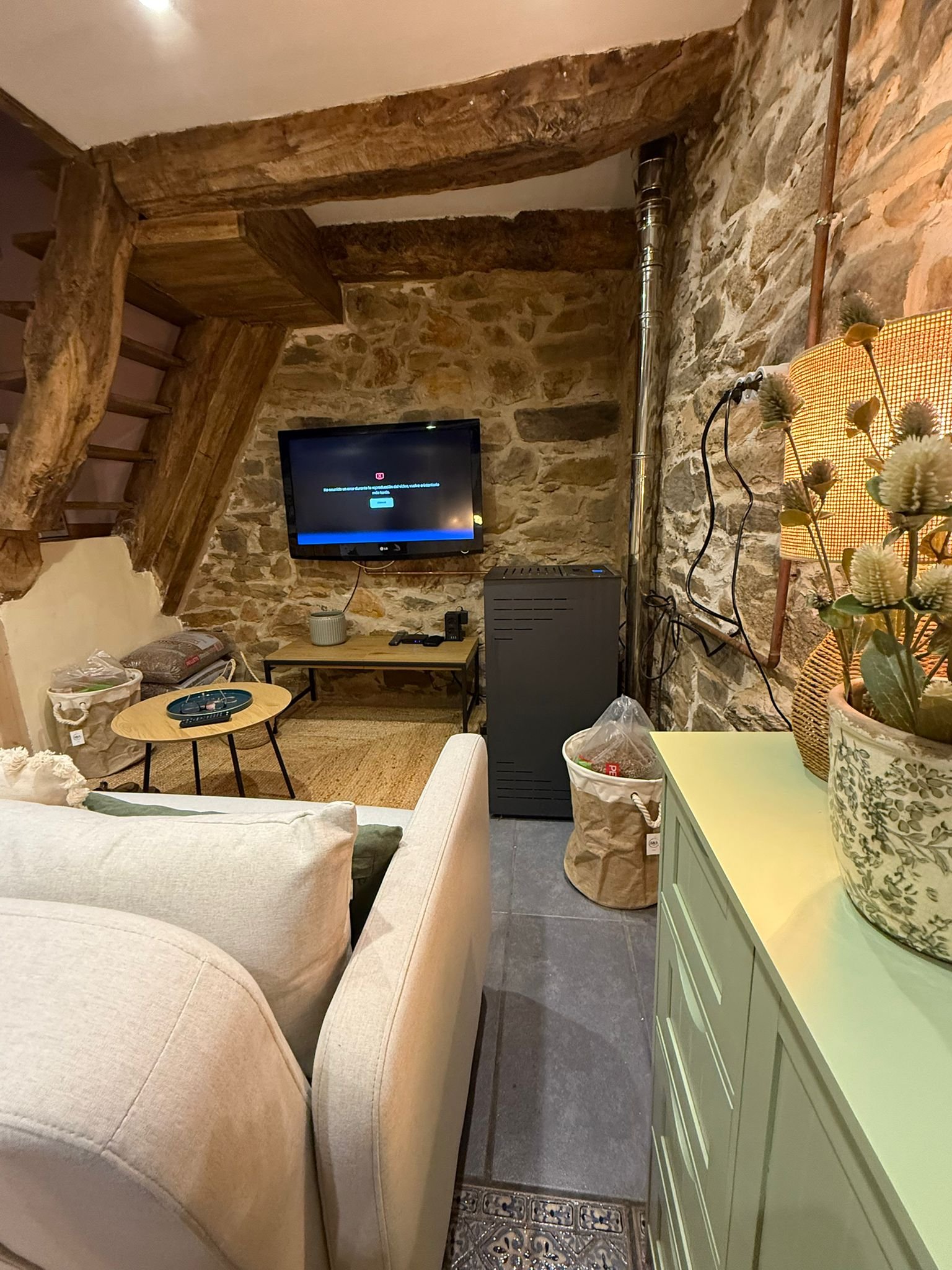 Television and pellet stove for a warm and inviting atmosphere.
